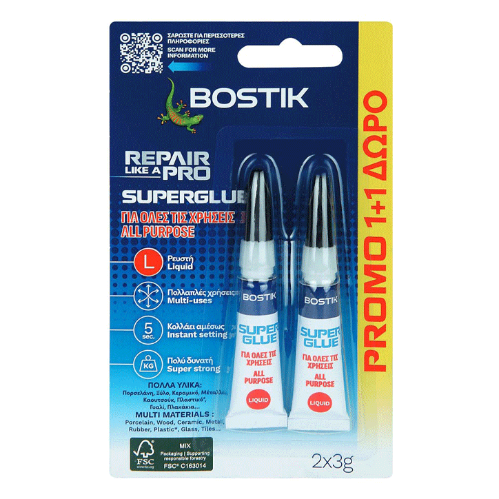 Bostik Super Glu Liquid is a fluid cyanoacrylate instant adhesive for strong and immediate bonding. Ideal for high tensile bonding on surfaces made of wood, porcelain, hard plastics, rubber, laminates, metals, etc